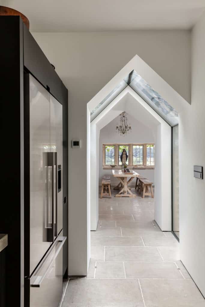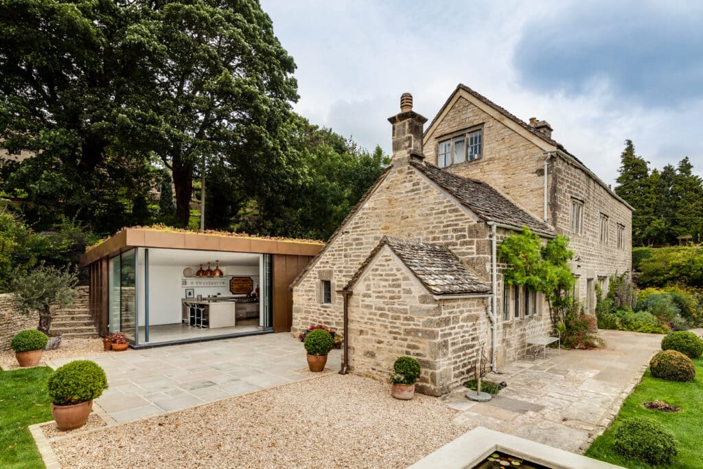 Refurbishment and alterations to existing Grade II listed farmhouse, nestled in Stroud valleys. Works included a new copper clad extension complete with a glazed link to the main house, underfloor heating and lighting design.